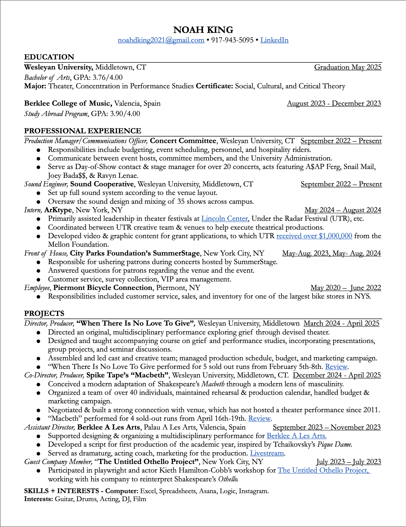 Wesleyan University, Middletown, CT — Bachelor of Arts in Theater (Concentration: Performance Studies); Certificate in Social, Cultural, and Critical Theory. GPA: 3.73/4.00. Expected May 2025.